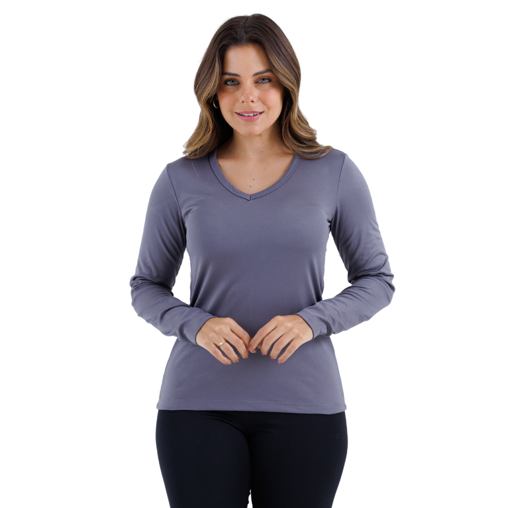 A blusa segunda pele térmica feminina com gola V em tecido fino é uma peça essencial para quem busca conforto, aquecimento e estilo discreto em dias frios. Desenvolvida com tecnologia de isolamento térmico, essa blusa é confeccionada em um tecido fino, com uma combinação de poliéster e elastano. Essa mistura de materiais proporciona um toque suave e leve sobre a pele, permitindo que a peça seja usada de forma imperceptível por baixo de outras roupas sem adicionar volume extra.O grande diferencial desta blusa é sua capacidade térmica. Apesar do tecido fino, ela conta com uma excelente retenção de calor, atuando como uma barreira contra o frio ao criar uma camada protetora que preserva a temperatura corporal. A tecnologia de tecidos respiráveis garante que, além de aquecer, a pele continue seca, já que o material é capaz de absorver e evaporar a umidade gerada pelo corpo, evitando o desconforto da transpiração.A gola V adiciona um toque de sofisticação e versatilidade ao design da peça. Ela oferece uma estética elegante e permite que a blusa seja combinada facilmente com diferentes tipos de decotes, tanto em roupas casuais quanto em trajes mais formais. A gola V também proporciona maior liberdade ao pescoço, tornando a blusa uma escolha excelente para ser usada sob blazers, suéteres ou casacos sem interferir no caimento das camadas superiores.A modelagem ajustada ao corpo é outro ponto-chave dessa blusa térmica. Ela é projetada para se adaptar perfeitamente à silhueta feminina, garantindo uma sensação de segunda pele, como o nome sugere, sem apertar ou limitar os movimentos. Sua elasticidade suave, proporcionada pelo elastano, oferece conforto em todas as atividades do dia a dia, seja em ambientes externos, durante caminhadas, ou em locais fechados, mantendo sempre a leveza e a flexibilidade.Além de funcional, essa peça é esteticamente agradável, com costuras discretas e acabamento impecável. O tecido fino permite que a blusa seja usada tanto como uma camada base, invisível sob outras peças, quanto como uma peça principal, dependendo da composição do look.